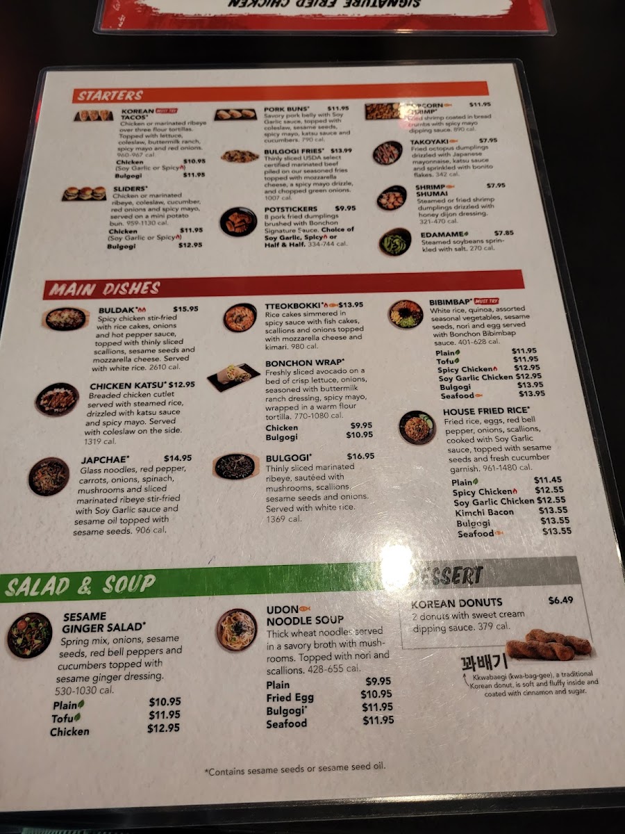 Glass noodles, red bell pepper, carrots, onions, spinach, mushrooms and bulgogi stir-fried with Soy Garlic sauce and topped with sesame seeds. (*Contains sesame seeds or sesame seed oil.)